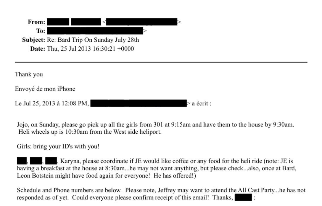 In a 25 July 2013 exchange between two redacted Epstein intimates, one writes “Jojo, on Sunday, please go pick up all the girls from 301 at 9:15am and have them to the house by 9:30am. Heli wheels up is 10:30am from the West side heliport. Girls: bring your ID’s with you!” before noting that “once at Bard, Leon Botstein might have food again for everyone! He has offered!)”