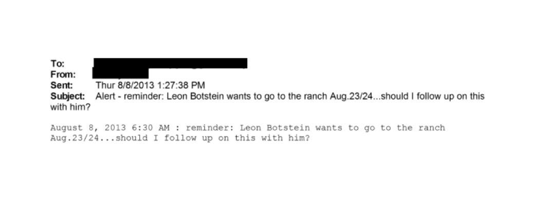 After Epstein’s July visit to Bard, in an August 2013 exchange, two redacted correspondents write that “Leon Botstein wants to go to the ranch Aug.23/24...should I follow up on this with him?” The “ranch” in question was Epstein’s home, Zorro Ranch, in New Mexico, where accusers said Epstein is known to have raped and abused girls. When asked about the potential ranch visit for a recent article in the upstate New York daily the Times Union, Botstein’s “spokesman,” David Wade, tut-tutted the idea saying that Botstein “never been to any ranch in New Mexico.” If he hadn’t, it didn’t appear to be for lack of trying.
