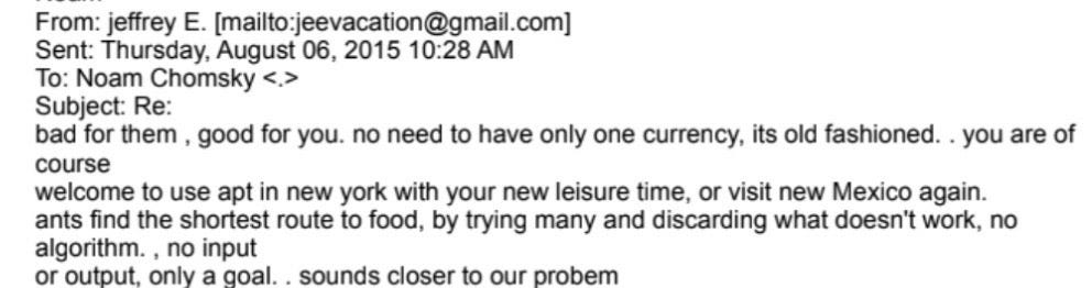 The following year, on 25 June 2016, Epstein writes to Chomsky, referring to his travels earlier that summer, “what was the highlight.? caribean [sic] is close to brazil, if you wanted you are always welcome and valeria can meet you there,” to which Chomsky respond later that day “Highlight? A chance to spend some free time alone together. Some good concerts. An evening in a small café with jazz duo playing Brazilian jazz. Things like that. Still eager to make it to the Caribbean, but looks as though we’ll have to wait.”